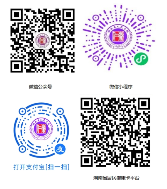 1网络预约:微信公众号、微信小程序、支付宝小程序、湖南省居民健康卡平台(已开通预约挂号、当日挂号、缴费、检验检查结果查询等功能);